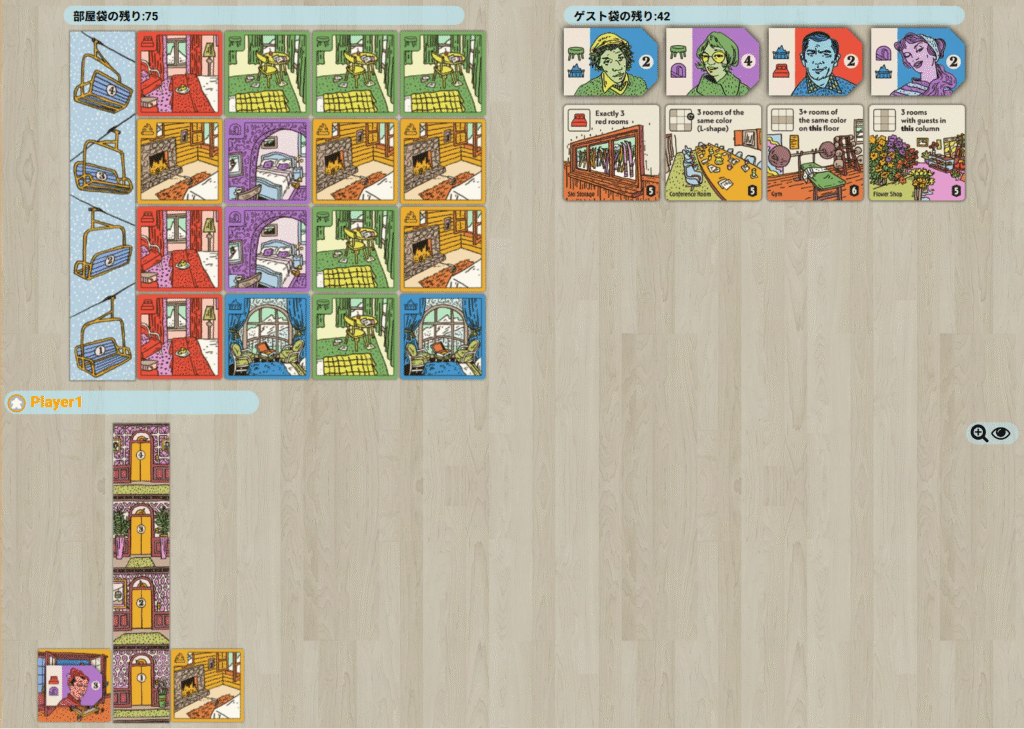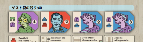 部屋の色や配置を考えつつ、条件に合ったゲストをうまく迎え入れることが重要です。限られた選択肢の中で効率よくロッジを拡張し、最も多くの得点を獲得したプレイヤーが勝利します。