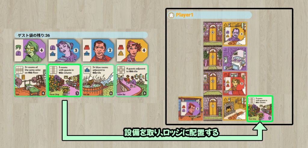 場にある設備を1枚選び、配置ルールに従って自分のロッジに配置します。