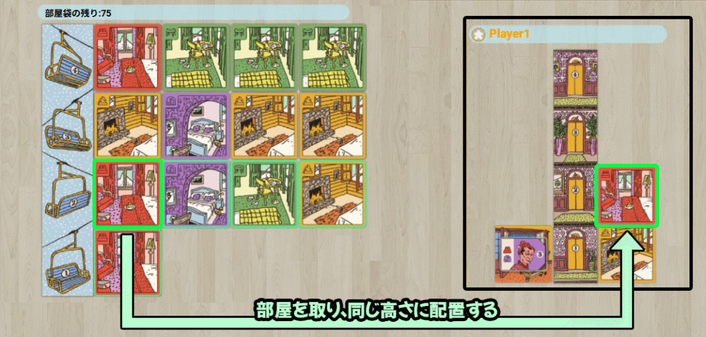 場にある部屋を1枚選び、配置ルールに従って自分のロッジに配置します。