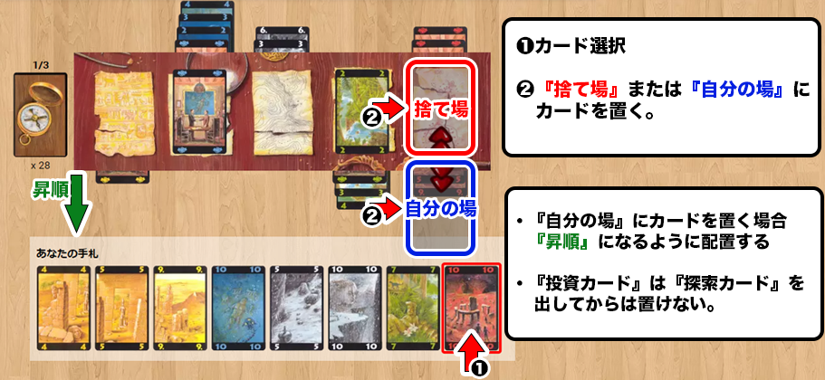 - 『自分の場』に出す『探索カード』は昇順で出さなければいけません。