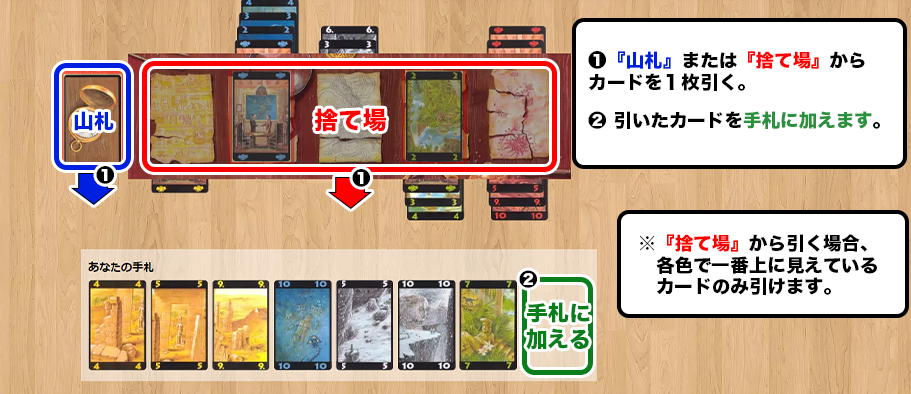 ❷ 『山札』または『捨て場』からカードを1枚引く。