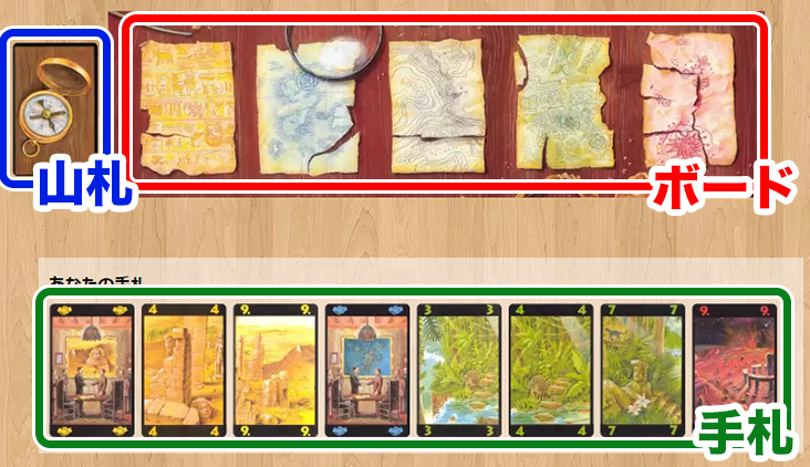 カードの5色はそれぞれ遺跡を表しており、『砂漠(黄)』『海底(青)』『ヒマラヤ山脈(白)』『熱帯雨林(緑)』『火山地帯(赤)』となっています。