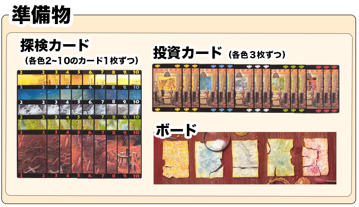 『ボード』を2人の間に置き、その隣に『探検カード』『投資カード』をよくシャッフルした山札を置きます。
