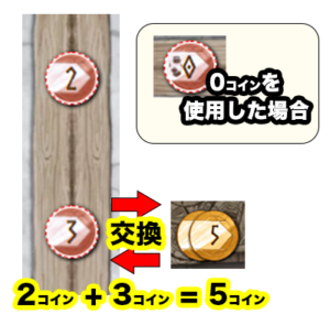 宝物庫に該当のコインが無かった場合は該当コインよりも高い数字のコインと交換します!(例の場合、『5コイン』が無ければ『6コイン』を取得)