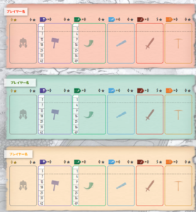 ボードには、各クラスごとに『階級章(ドワーフの左上の帯)の数』と『現在の得点』が表示されています。