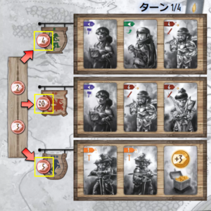 各世代の終わり(山札が無くなった時)、ボードに配置させた『傭兵』を左上にある2色のクラスの内好きな方に配置していきます。