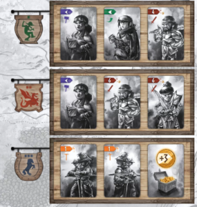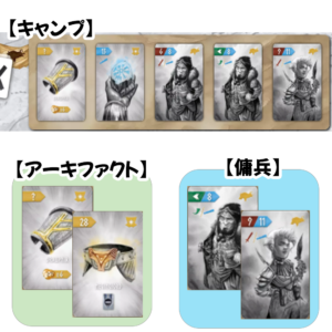 各酒場で入札に勝った(一番手になった)プレイヤーは酒場からカードを取る代わりに『キャンプ』から『アーティファクト/傭兵』カードを1枚取得することが出来ます。