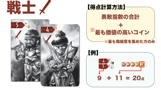 『戦士』は『勇敢指数(左上の数字)の合計』に手持ちのコインの最も高い数字を加算させた数字が得点となります。