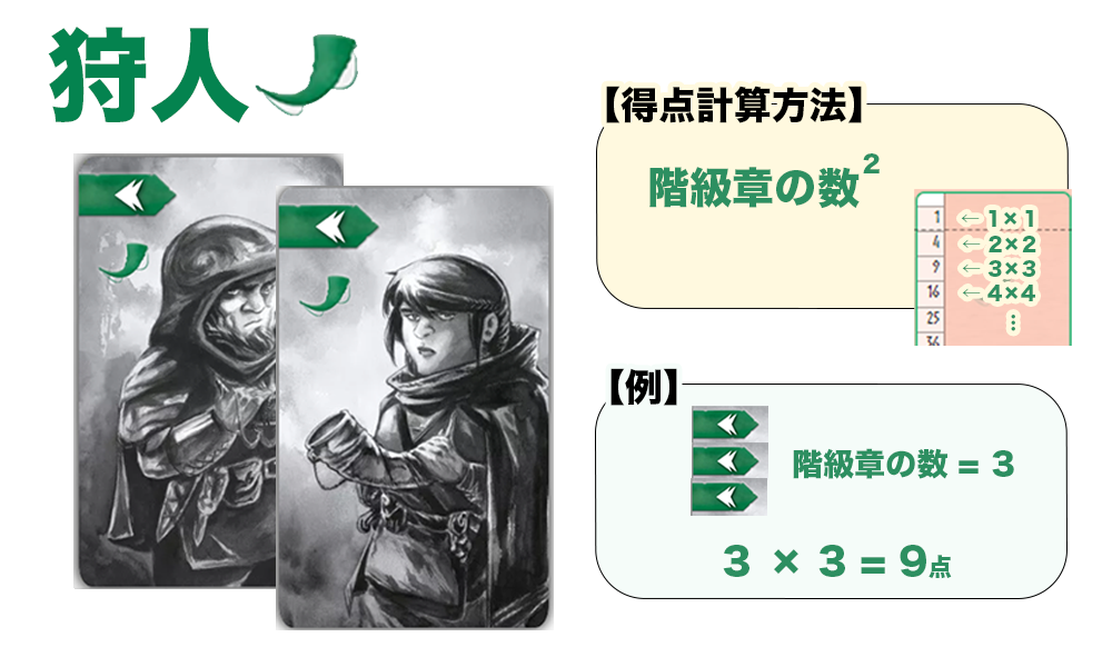 『狩人』は取得した『階級章の数』を2乗した値が得点となります。