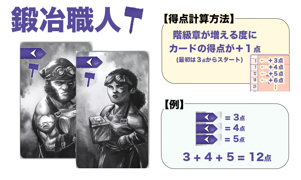狩人同様、枚数を集めるごとに取得できる得点が増えていくカードですが、得点の増加数は2乗で計算される狩人より少なめです。
