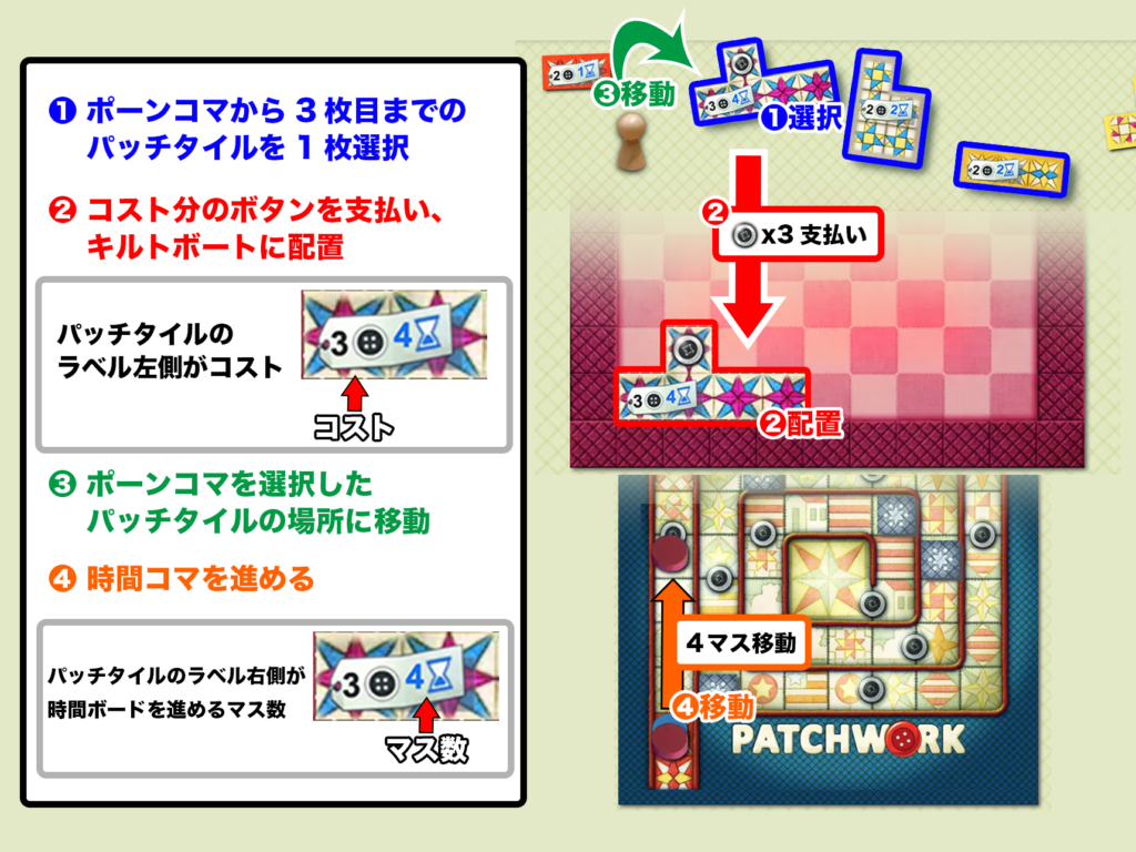 ポーンコマから3枚目までのパッチタイルの中から1枚を選びます。