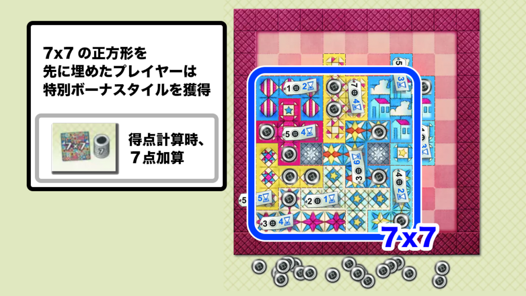 先にキルトボードに7×7マス分の正方形にパッチタイルを配置したプレイヤーは特別ボーナスタイルを獲得することができます。(既に獲得されている場合は獲得できません)