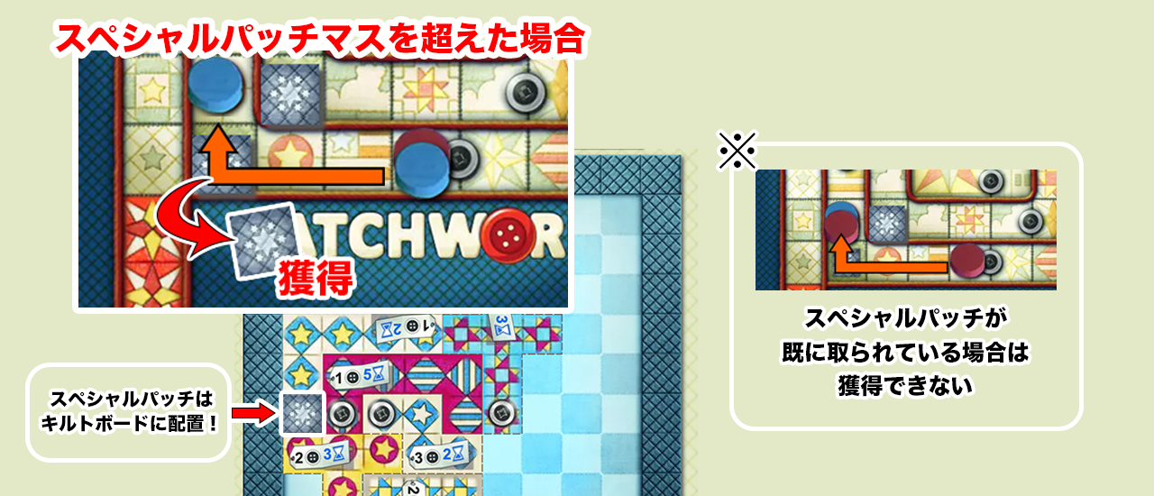 既にスペシャルパッチタイルが取られた後のマスは跨いでも何もおきません。