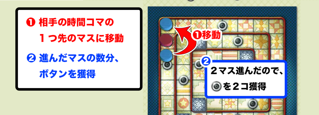自分の時間コマを相手の時間コマの1つ先のマスまで進めます。