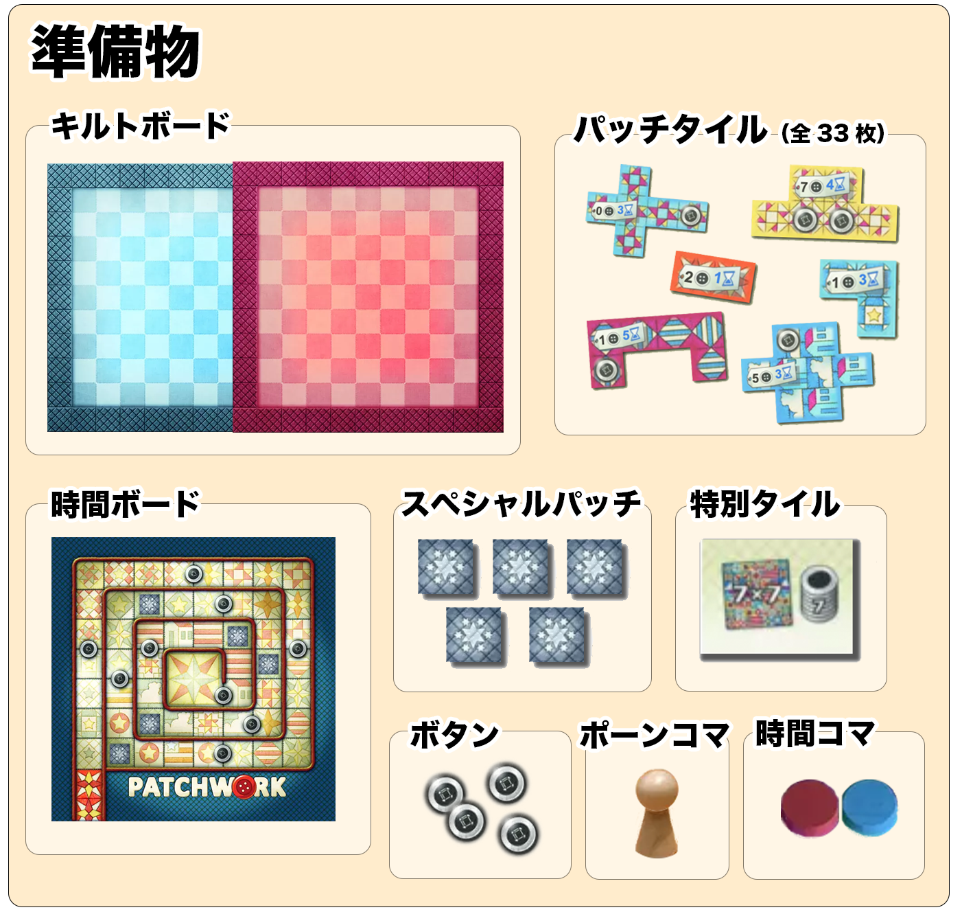 このゲームは9×9のキルトボードの中に上手くパッチタイルを埋めていき、相手よりも良いパッチキルトを作成することを目的としたボードゲームになります。