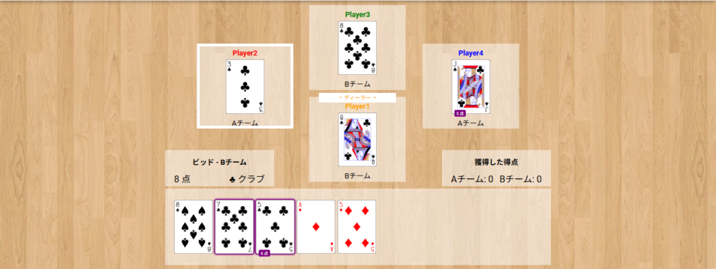 いかに高得点トランプを確保しながら、相手チームの得点を阻止するかが鍵となります。