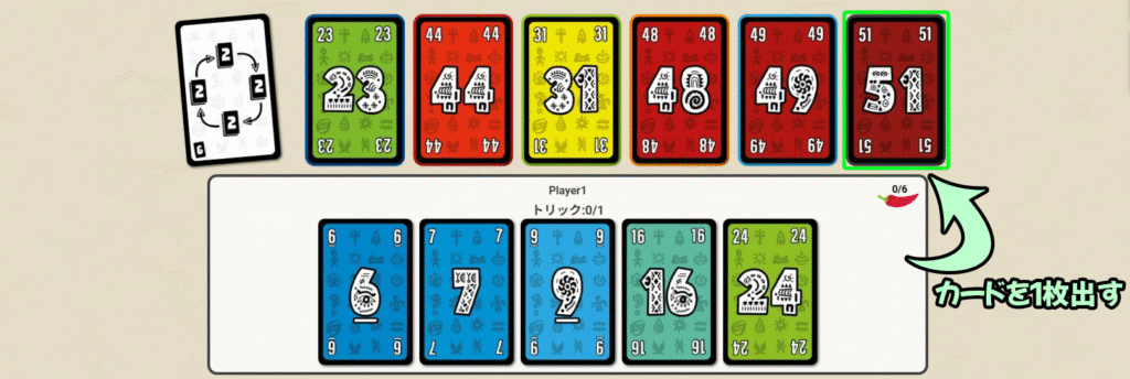| ❶ | カードをプレイする リードプレイヤーから順番に、各プレイヤーは手札からカードを1枚ずつ場に出します。 |