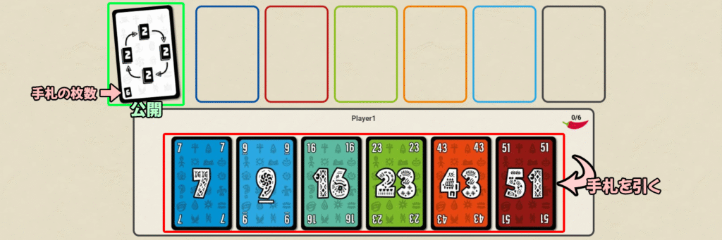 その後、記載されている数字の枚数だけ、各プレイヤーは数字カードを引いて手札を作ります。