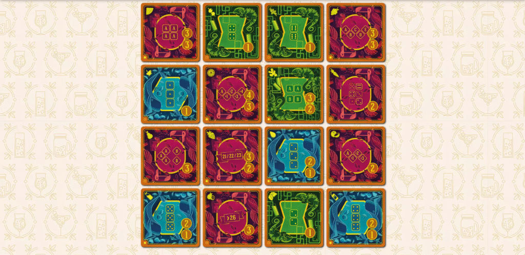 | ❹ | コースターの準備 コースター25枚をよく混ぜ、その中から16枚を中央に4×4になるようランダムに配置します。 プレイ人数に応じて、指定された位置のコースターは表面(1マス)/裏面(2マス)を使用します。 ※余ったコースターは箱に戻します。 |