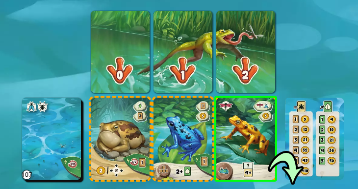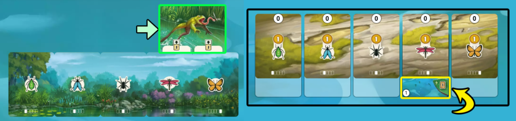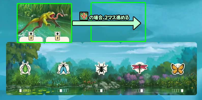 移動カード「1」または「2」の下にあったカードを取った場合、カエルカードをエサ列に沿って、その数値分だけ前進させます。