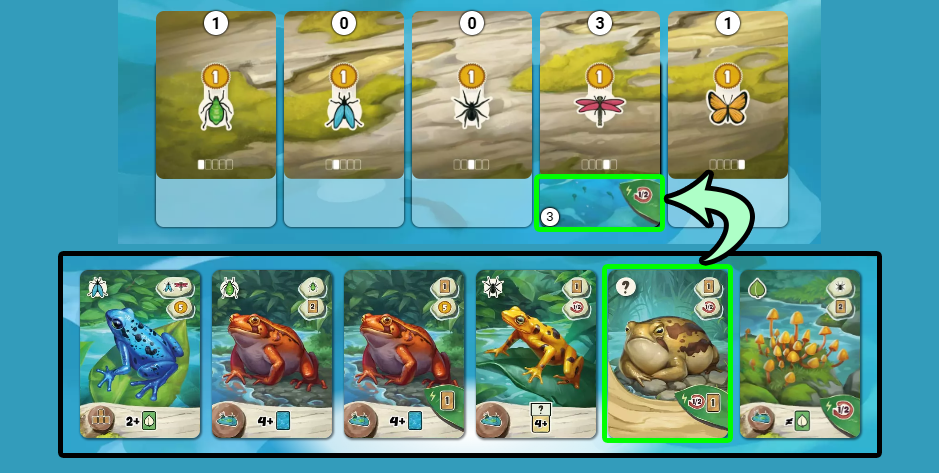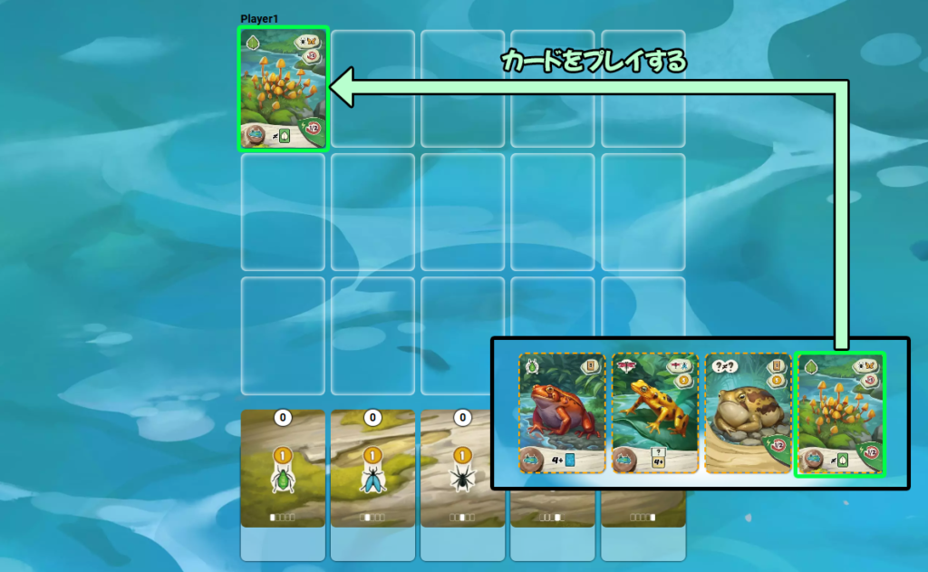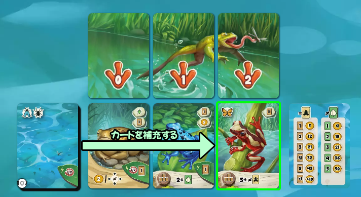 場にある3枚の中から、カエルカードまたは生息地カードを1枚選んで手札に加えます。