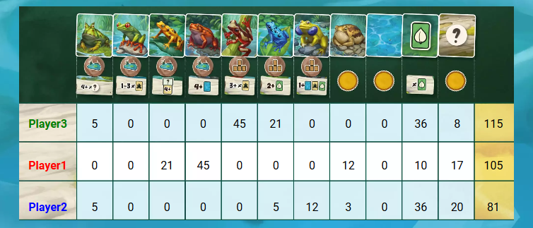 8種類のカエルそれぞれに独自な得点条件があり、プレイするたびに最適解が変わるのも魅力。