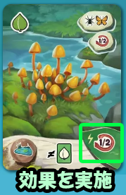 配置したカードに右下の葉っぱや下部に⚡マークがある効果が記載されている場合、カードを配置後すぐに効果を実施します。