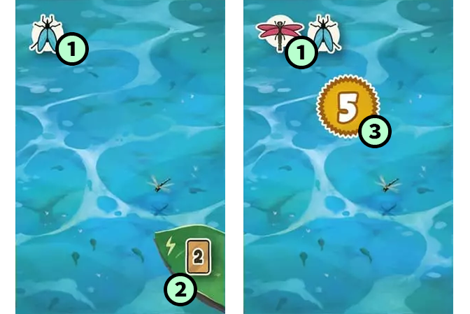 | ❷ | エサを差し込む カエルが現在またがっている2枚のエサアイコンに対応するエサカードの下に手札から1枚ずつ差し込みます。 |