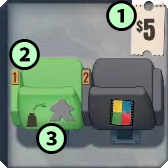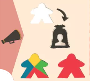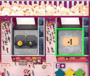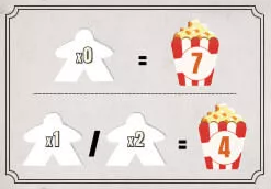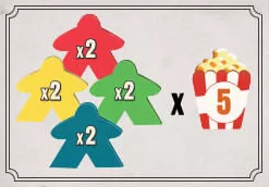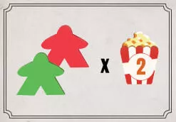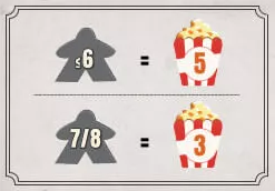 ![]() | ゲーム終了時に観客(色に関係なく)が6人以下の場合、ポップコーンを5個獲得します。 7~8人の場合は、ポップコーンを3獲得します。 |