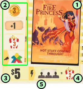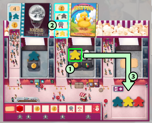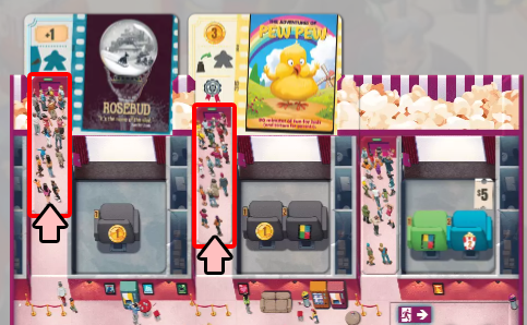 | シアタートロフィー | 3つのシアターの合計コストを数えて、他のプレイヤーと比較します。 合計コストが最も高いプレイヤーは、シアタートロフィーを獲得し、記載されている数字分のポップコーンを獲得します。(3~4人プレイの場合は2位まで獲得) 【2人プレイ】 ・1位:3ポップコーン 【3~4人プレイ】 ・1位:5ポップコーン ・2位:3ポップコーン |