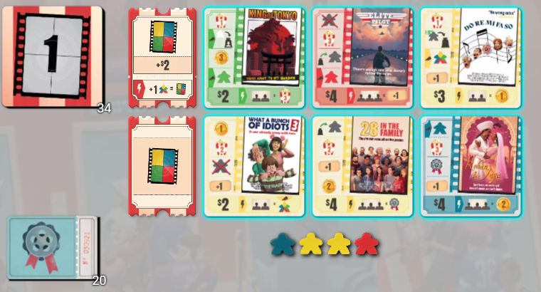 ゲームは複数ラウンドにわたって進行し、ラウンドが進むにつれて映画の上映期間が短くなり、使えるアクションが減っていくのも特徴です。短期的な効率と長期的な得点計画のバランスが求められます。