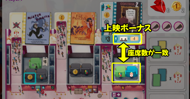 プレイヤーは映画を購入してシアターで上映し、観客を座席に配置することで、座席アクションや映画アクションを実行していきます。観客は色ごとにお気に入りのジャンルを持っており、映画と色が一致した観客だけが映画アクションを実行できるため、袋から引く観客の管理や配置の工夫が重要になります。