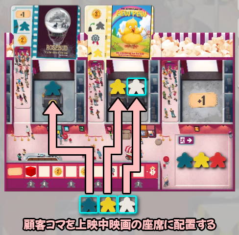 上映フェイズでは、以下の手順で観客を座席に配置し、アクションを実行します。