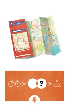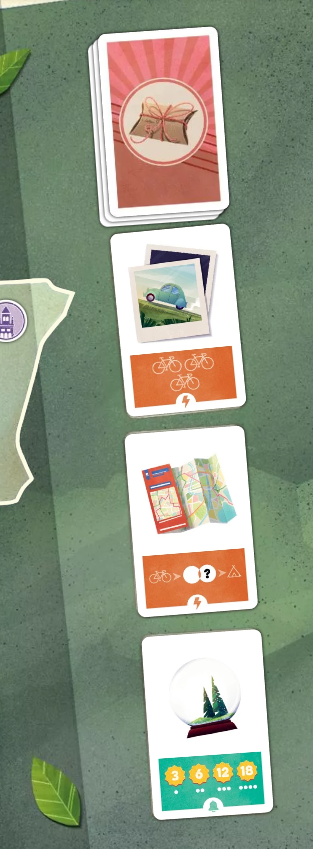プレイヤーは自転車で各地域を移動し、キャンプを設置して効果を得ながら、ポストカードに切手を貼って送付します。ポストカードの送付やギフトカード、旅行日程カードの達成などから得点を重ね、最終的に最も得点の高いプレイヤーが勝利となります。