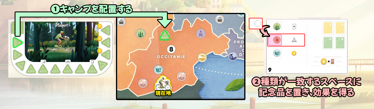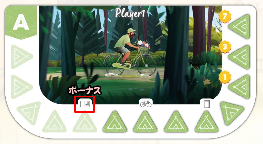 キャンプを一定数置くと、プレイヤーボード記載のボーナスを実施できます。