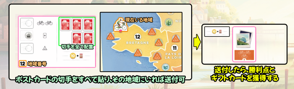 ポストカードを送付した場合、右下に記載されている勝利点を直ちに獲得し、あわせてギフトカードを1枚獲得します。