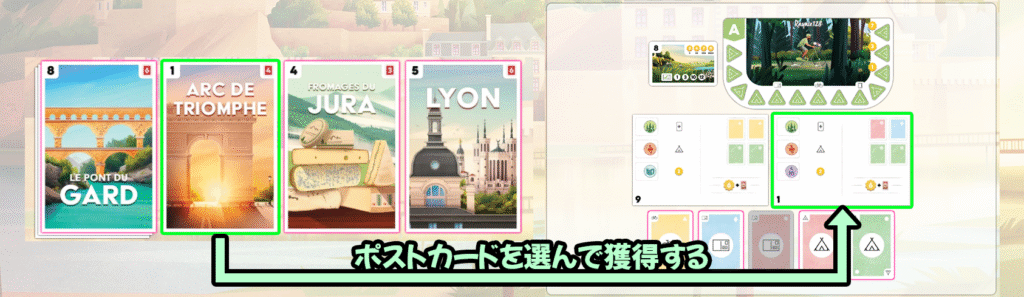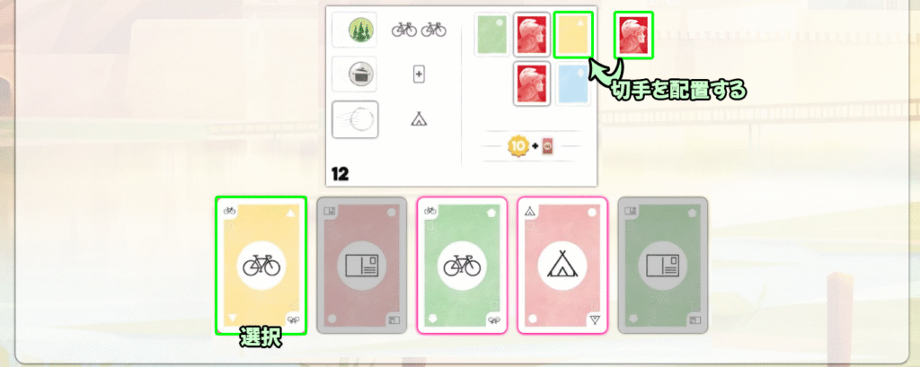 カードの色に対応するポストカードの空いている切手マスに、切手トークンを1枚配置します。(カードのシンボルは使用しません)