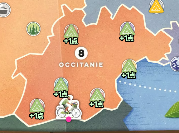 地域内のキャンプ地をすべて自分のキャンプで埋めると、即座にの地域に置いたキャンプ数分の得点を獲得します。