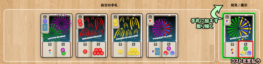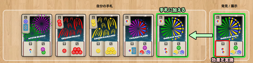 | ・ | 発見 | : | 効果(左下)を実施し、カードを手札に加える |
