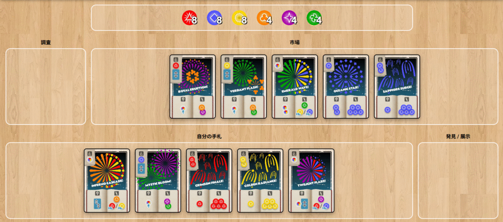 手番を繰り返しながら火花トークンを集め、公開の条件を満たすことで手札の枚数を減らすことができます。5枚目のカードを公開できれば、その時点で即座に勝利します。