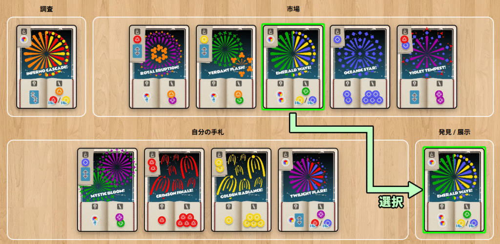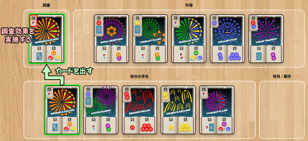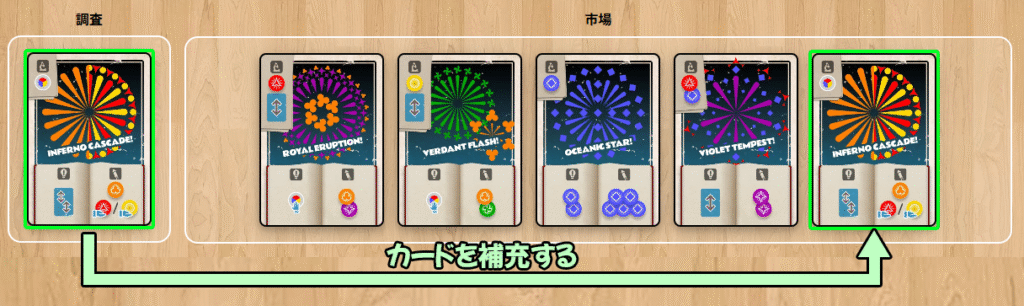最初に調査で使用したカードを、空いた市場の位置に置いて、市場のカードを補充します。