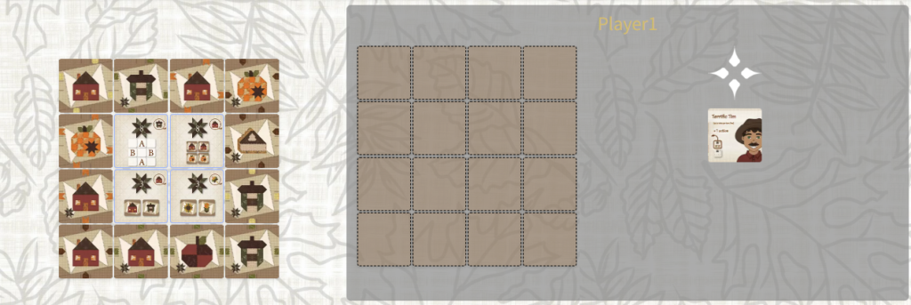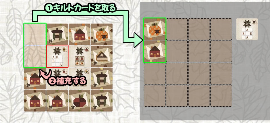 パターンエリアの4つの山から1枚を選び、自分のキルトの近くに配置します。