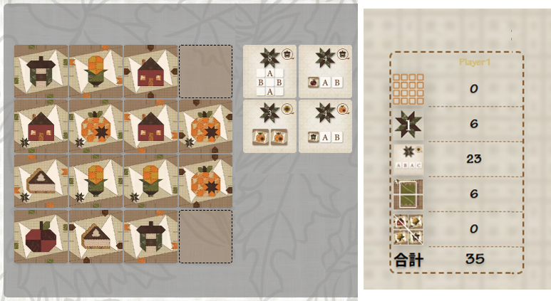 | ・ | 各パターンカードは、キルト内でパターンが完成した回数分だけ得点できます。 (例:3点のパターンカードがキルト内に2回完成していれば、6点になります) |