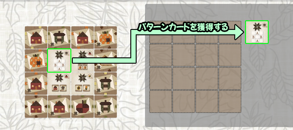 キルトブロックを配置し、パターンカードに記載している形が完成する度、得点を獲得します。
