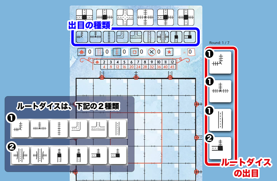 『ルートダイス』の出目の種類は上から2段目に書かれているので、こちらを確認しつつ❷の記入をしてみてください。