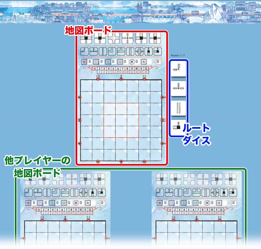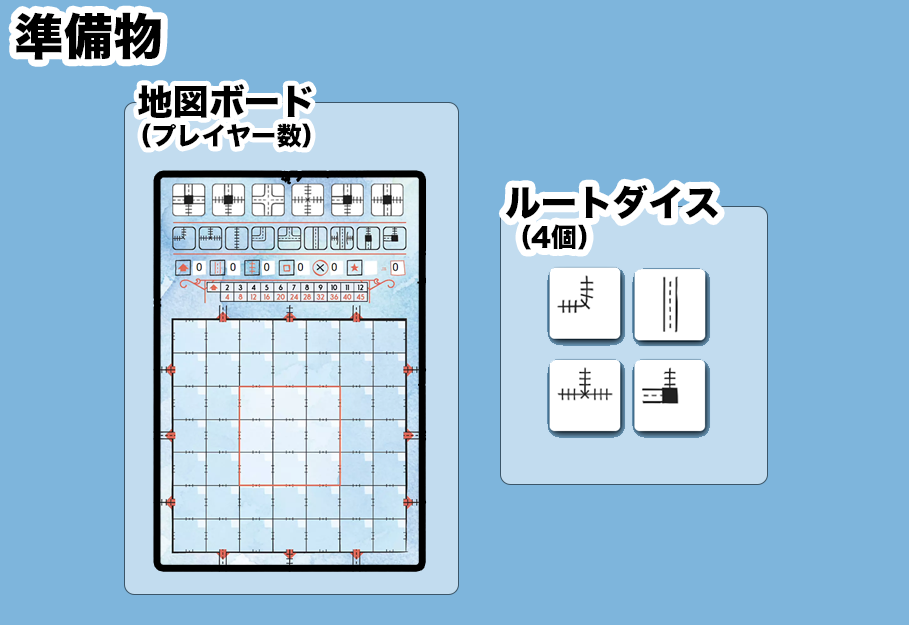 各プレイヤーに『地図ボード』を配り、全体の場に『ルートサイコロ』を置くことで準備が完了になります。