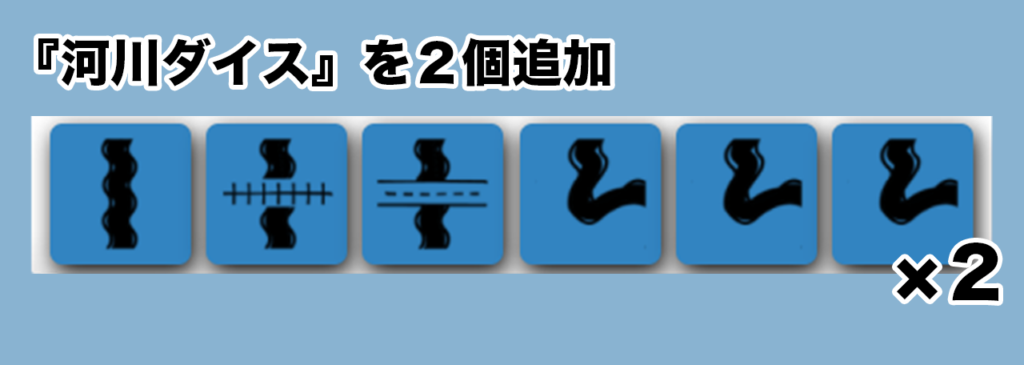- 通常の『ルートダイス』にプラスで『河川ダイス』を2つ振ります。