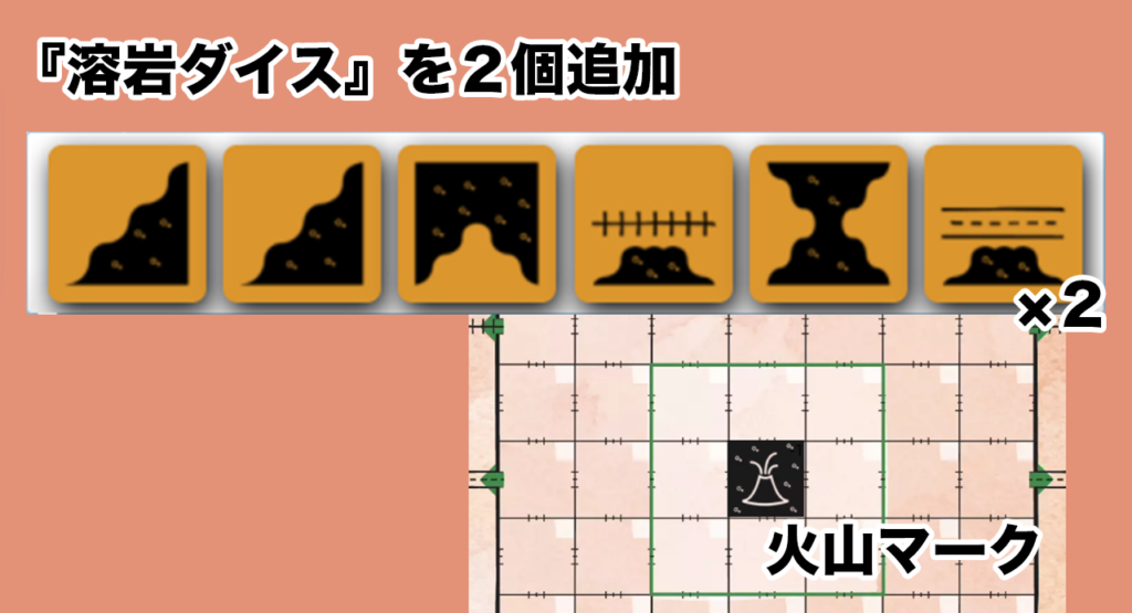 - 通常の『ルートダイス』にプラスで『溶岩ダイス』を2つ振ります。