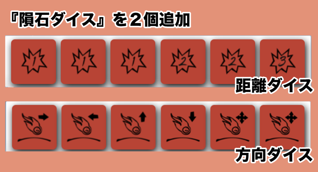 - 2種類の『隕石ダイス』は、距離1・2・3が書かれている『距離ダイス』と、東西南北の方向が書かれている『方向ダイス』があります。