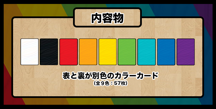 レインボーを完成させたり、相手にエラーやシャドウを起こさせることで、場にあるカラーカードを獲得して、相手より多くのカードを獲得することが目的です。